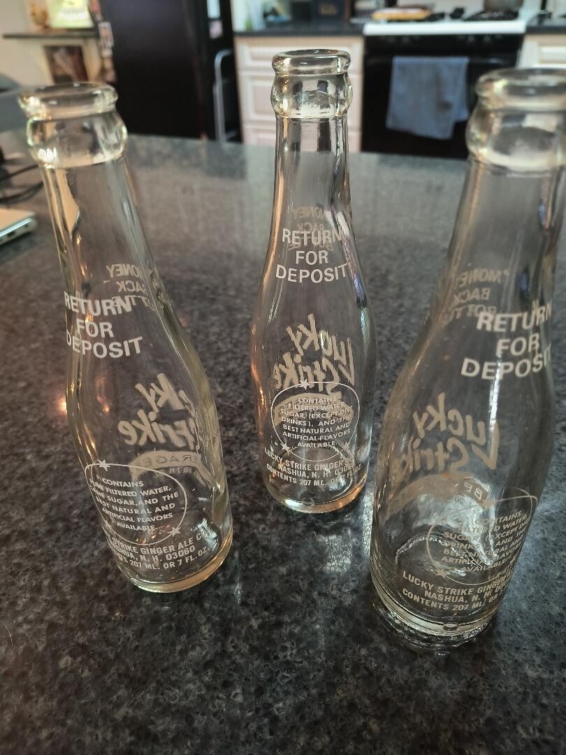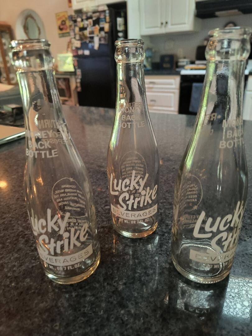 Three vintage lucky strike bubble top bottles. Beautiful, clean, clear bottles, no nicks, cracks, breaks. View lisitings for the bottle capper and cork backed gold caps available as well.