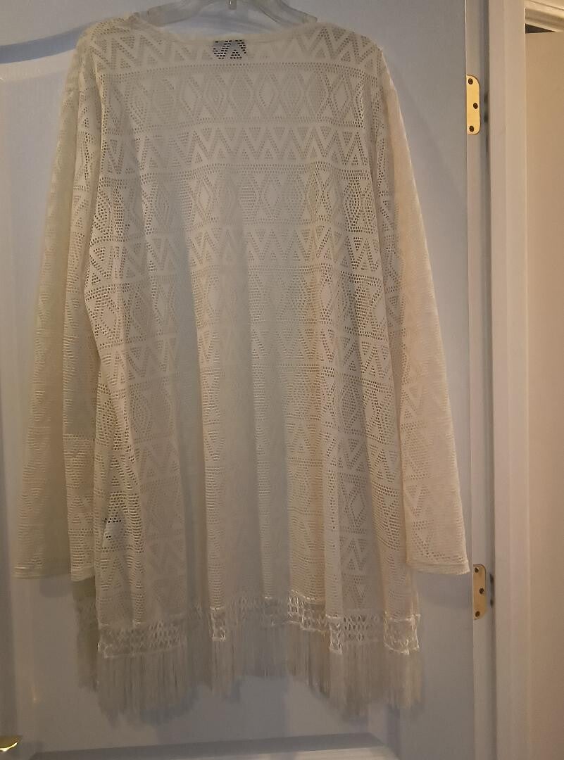 Crocheted style overlay jacket/Cover up. Size xlg, fits more like a large. Color is offwhite, closer to cream/vanilla color. Gently used but in like new condition. Sleeves are long with bell type openings at hands. Item has a beautiful silky looking fringe on bottom. Item is long, will cover to back of where the leg bends, at average height. Lightweight, perfect with a camisole, tank top, over a crop top or just as a light type of sweater over blouse. Very versatile, very feminine item.
