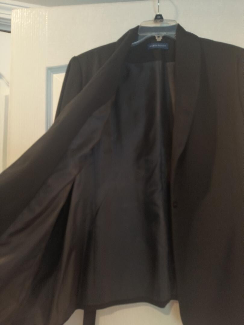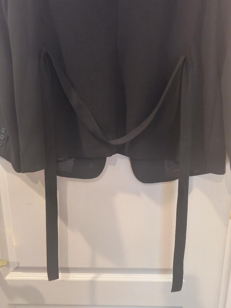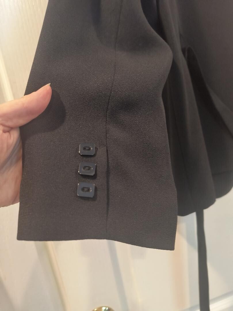 Lovely fully lined black jacket. Perfect to dress up any outfit or wear with jeans while your estate shopping. Item has square buttons and an adorable tie in the back. Feminine and classy. Waist length, size 16 women's.