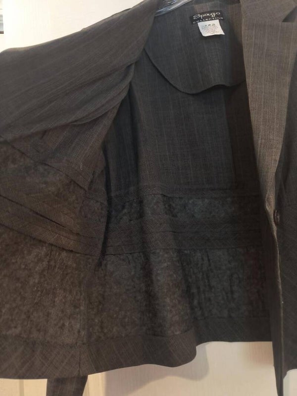 Lovely dark grey pin striped jacket/blazer. Perfect for formal or semi cashual. This item would be perfect for your business power meetings, sales floor or a chilly fall day in jeans,out thrifting with your girls on the boardwalk. Gently used and upcycled, in outstanding like new condition.