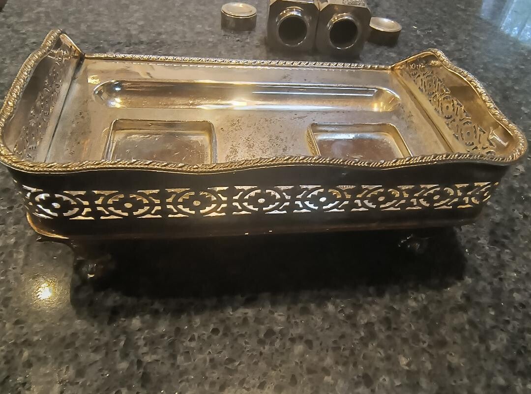 This is super unique and comes from an Estate collection from India. I am uncertain of how to know the exact material this is made from but it does tarnish like silver, it has weight to it, not thin, light or flimsy at all. Each jar has etchings on the front and has covers for each. The tray itself has a sitting spot for each inkwell jar as well as an indent for a pen or quill. The tray is beautifully made with design and taste. The tray has tiny claw feet and is about 8' x 6" roughly. I have never seen such a beautiful item. This would really pop on a desk in your office or on a bookcase, in an art studio or as home decor. This set is really stunning and I can only imagine once its cleaned properly, how much more gorgeous it will be.