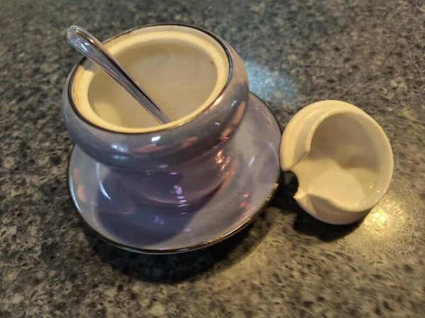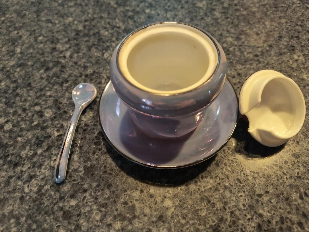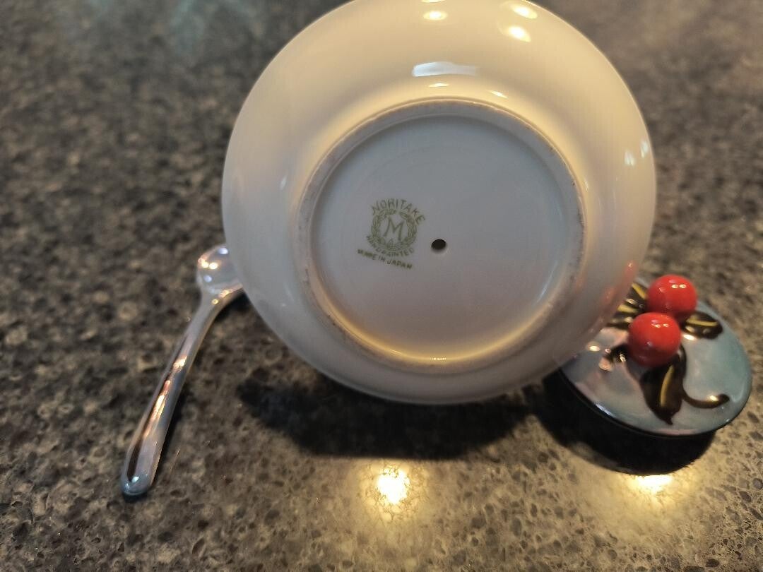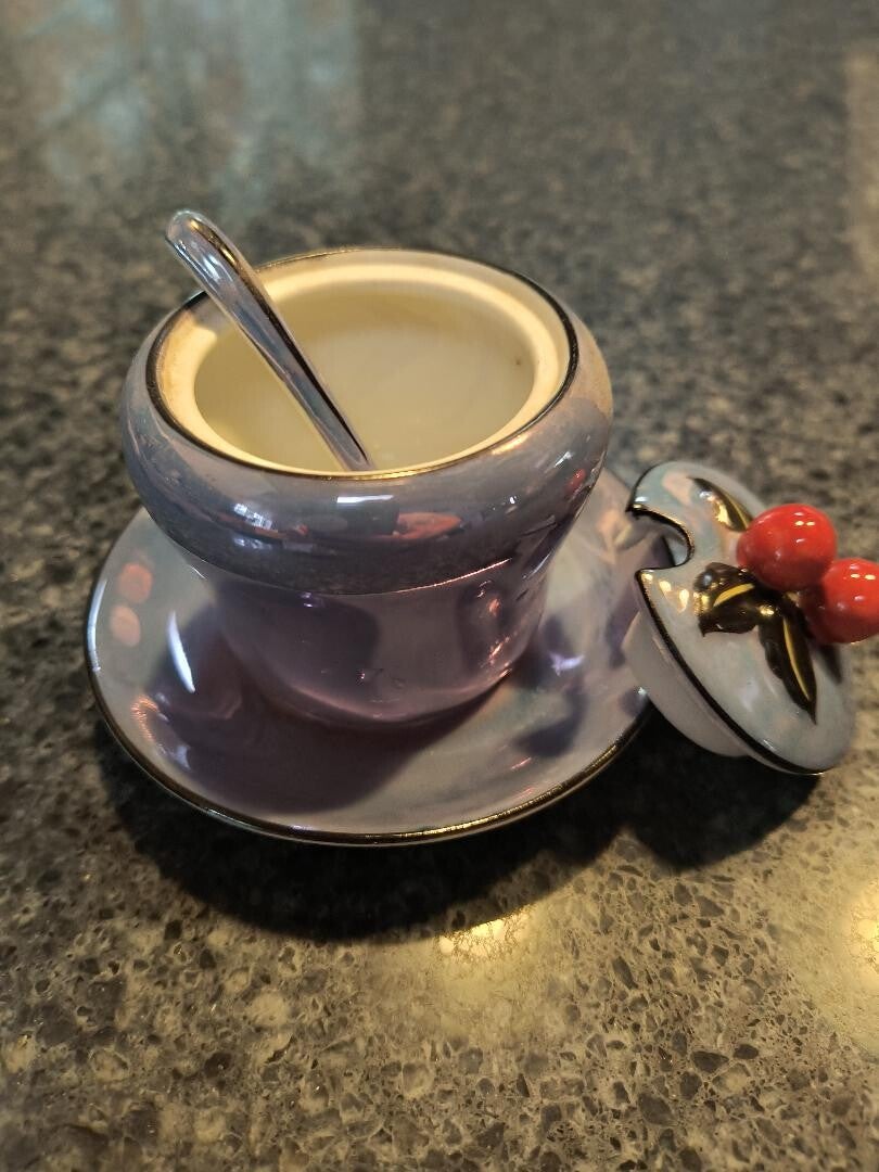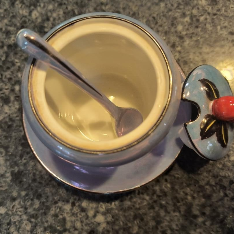 This lovely little decorative sugar bowl is an opalescent (Lusterware) blue with white accent and red cherries on top cover. Comes with tiny matching blue spoon that falls into indent made for it. It is the Noritake brand, stamped on bottom of bowl. Beautiful collectable. What a unique find!!