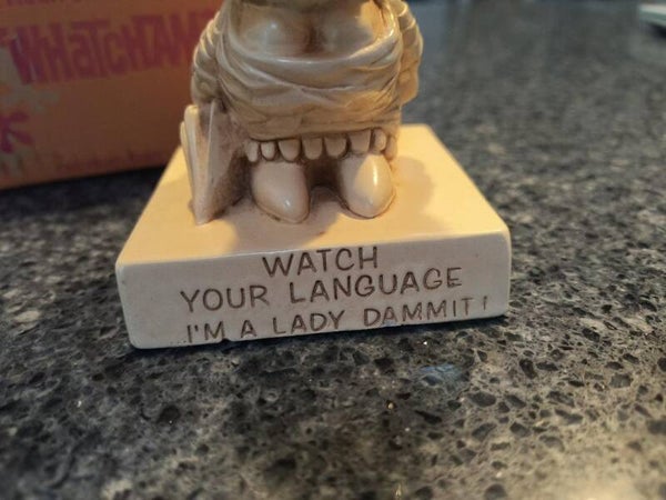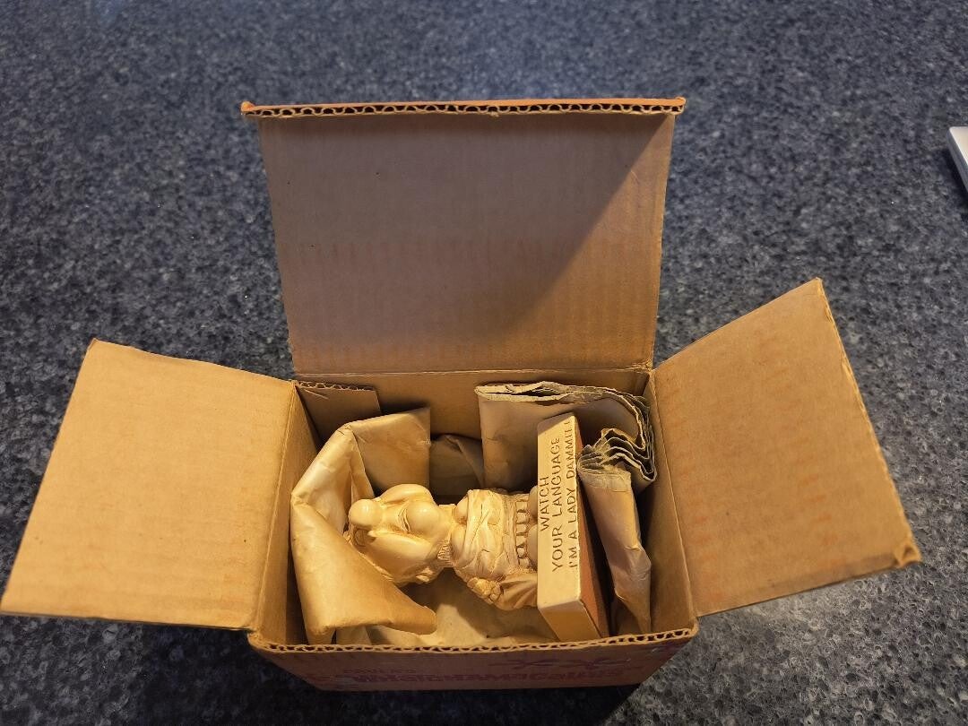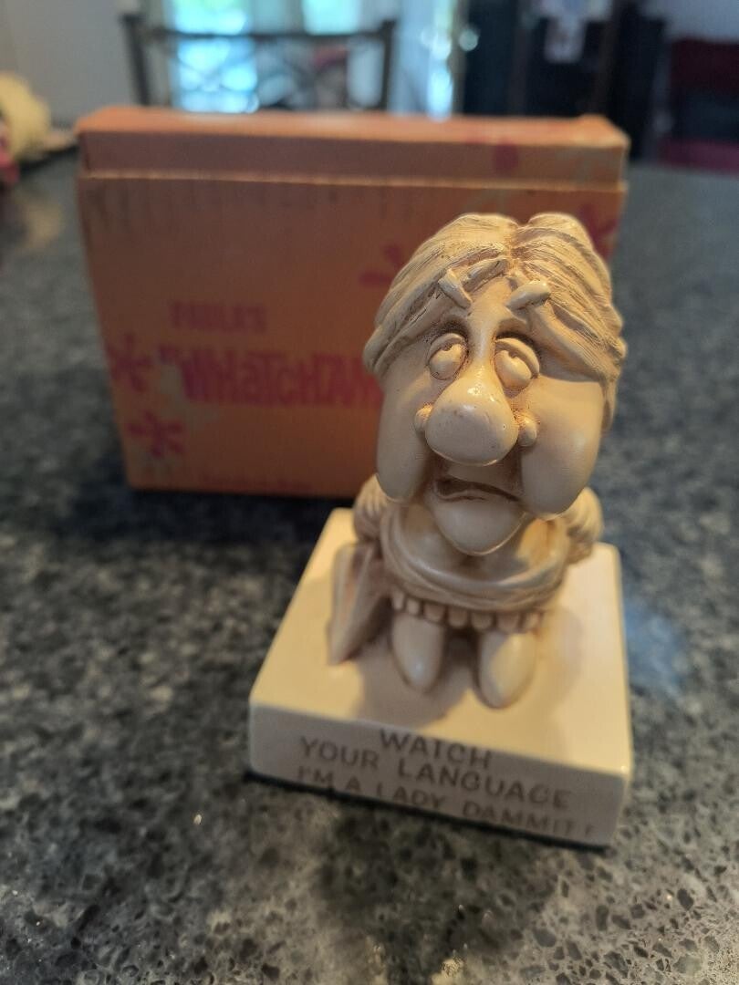 Vintage 1960s collectable Paula staue also known as a "Whatchamacallit". This item is in great condition in its original box and paper. Statue reads "Im a lady damnit". View photos, nice find!Date, maker etched on side bottom.